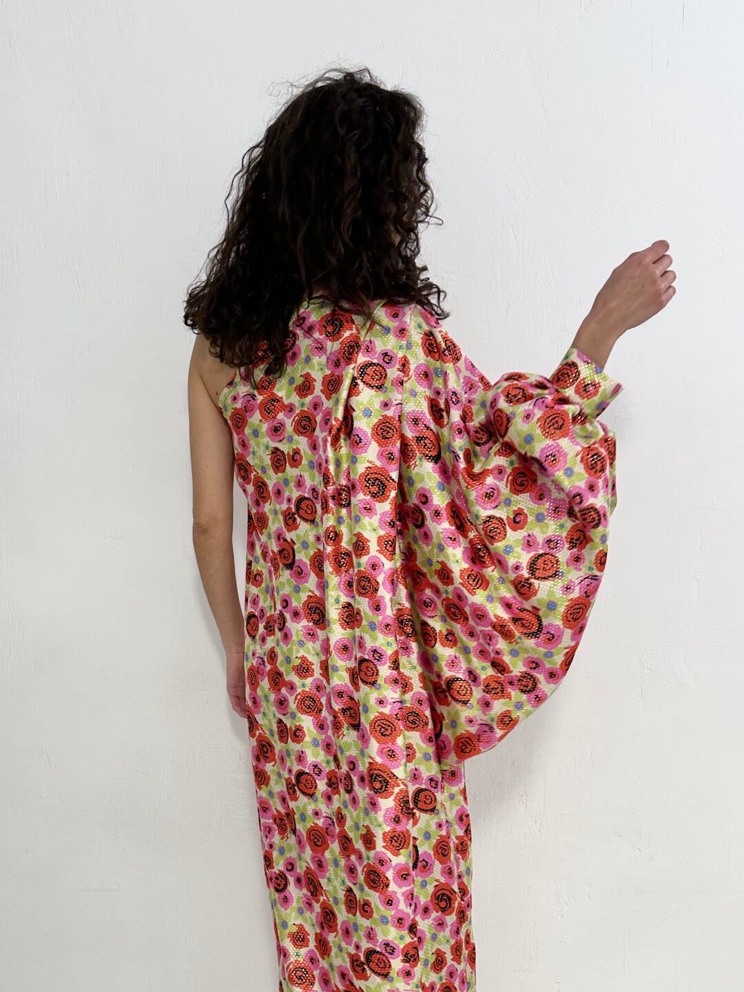 El vestido MARLA es un vestido asimétrico con silueta fluida que destaca por su maxi manga abullonada con puño llena de movimiento. Está confeccionado en seda natural estampada en fuxia, lima, rojo y matices en negro con hilos de lurex dorados que atrapan la luz en cada paso. Una pieza versátil, con fuerza y personalidad, para invitadas que quieren salirse de lo común sin renunciar al confort.